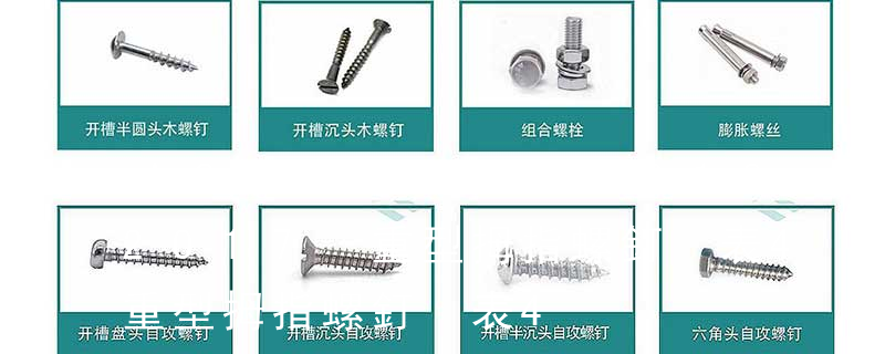 1.機螺釘 2.自攻螺釘 3.鉆尾螺釘 4.墻板釘 5.纖維板釘 6.木螺釘7.六角木螺釘 8.不脫出螺釘 9.組合螺釘 10.微型螺釘 11.家具螺釘 12.電子螺釘 頭型 :1.六角頭(hexagon head) 2.六角頭法蘭面(hexagon head